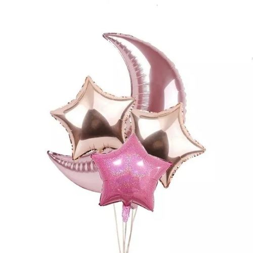 Quantidade: 1 balão foil lua, 2 estrelas rosa gold, 1 estrela rosa iridescente