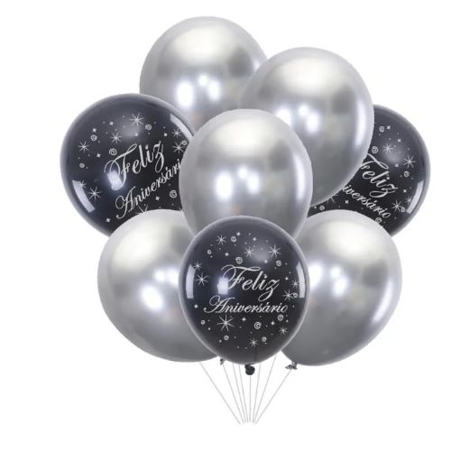 Quantidade: 5 balões Prata, 3 balões pretos feliz aniversário