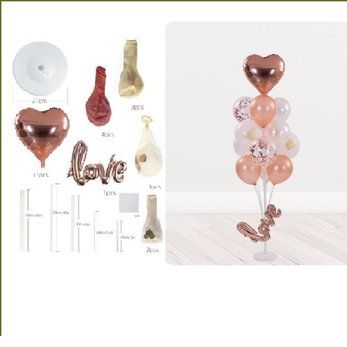 Inclui: 1 base com expositor balões, suportes para aplicar, 1 balão foil coração, 2 balões impressos, 3 balões com confettis, 7 balões lisos, 1 balão foil love