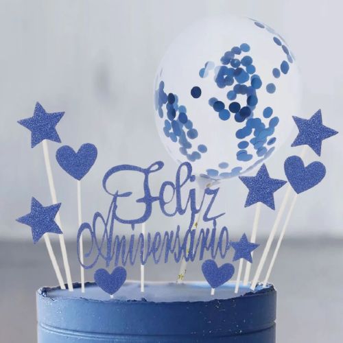 Contém: 1 topo Feliz Aniversário, 1 balão, 4 corações e 4 estrelas